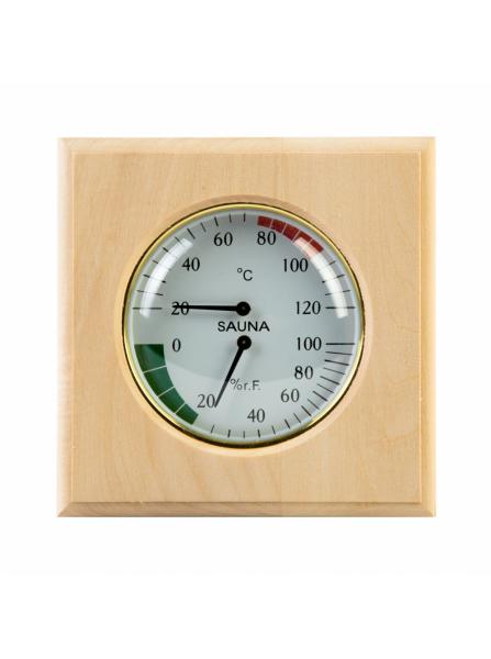 Термогигрометр - прибор для измерения и регулировки влажности воздуха в парной бани, сауны или хамама. Данная банная станция это 2в1: Термометр (для измерения температуры в парилке) и гигрометр (для измерения влажности в парной). Прибор служит для измерения температуры и влажности. Изготовлен из термостойких материалов. Предназначен для настенного размещения. Великолепное исполнение в деревянном корпусе. Циферблаты закрыты стеклом.Крупный циферблат позволяет контролировать микроклимат даже в условиях сильного пара.Данный прибор великолепно подходит для использования в любом парильном помещении сауны, бани или хамама. ВНИМАНИЕ! Иногда термогигрометры нуждаются в калибровке. Для этого необходимо: 1. Намочить полотенце теплой водой и завернуть в него термогигрометр на 30 минут. 2. Если показания гигрометра ниже 95%, необходимо отверткой докрутить показание до 100% через отверстие в задней панели.